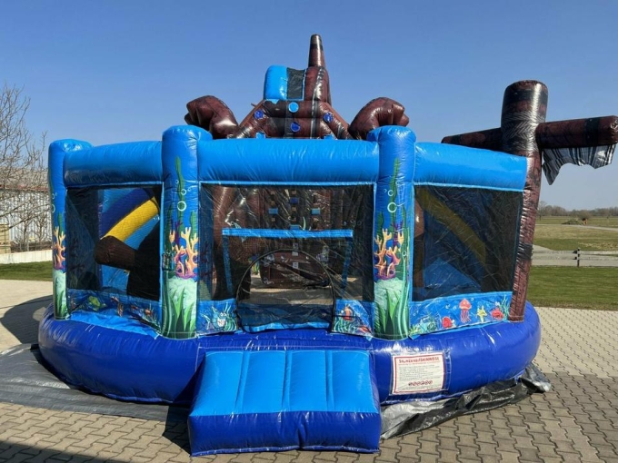 Die Hüpfburg (E) Unterwasserwelt Multiplay mit Rutsche entführt Klein und Groß in die Unterwasserwelt. Mit den abgebildeten, lustigen Meeresbewohnern und der fröhlichen Farbgestaltung ist das Unterwasserwelt Multiplay ein absoluter Hingucker auf deiner Privatveranstaltung oder auch Straßenfesten, Tag der offenen Tür usw. Durch die angebrachten Spielgeräte und der integrierten Kletterwand bietet dieser Playground viel mehr als nur Hüpfen und Rutschen!