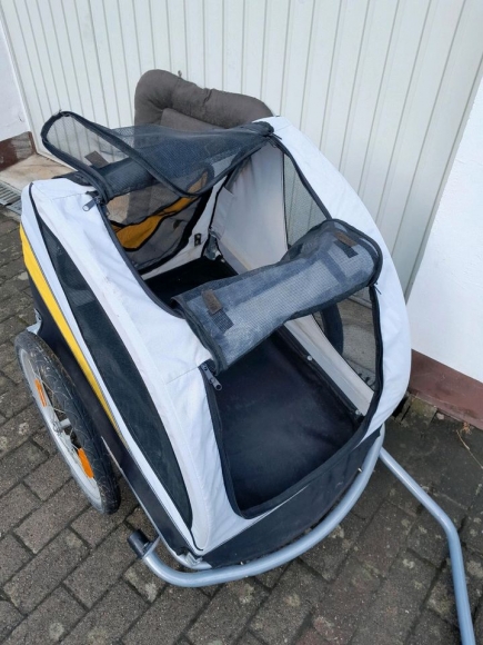 Fahrradanhänger für Hunde zu verschenken. Voll funktionsfähig, 1 kleiner Riss siehe Bilder. Liegefläche 60x80 cm, max 45kg, inkl. Matte. Zusammenklappbar Nur Abholung. Solange Anzeige online ist, ist der Hänger noch verfügbar.