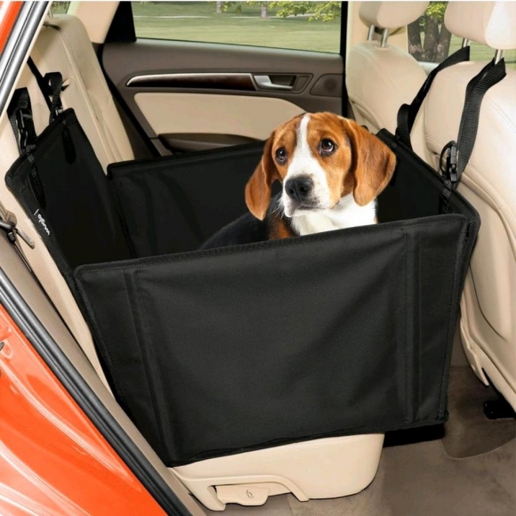 Extra Stabiler Hunde Autositz - Verstärkter Autositz für kleine und mittlere Hunde mit 4 Befestigungsgurten - Hochwertiger und wasserdichter Hundeautositz für den Rücksitz im Autos (M-Größe, Schwarz)