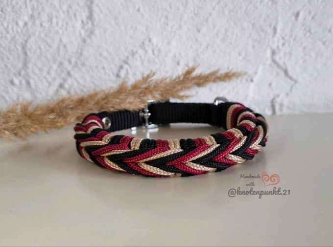 Dieses Paracordhalsband ist längenverstellbar und passt ab einem Halsumfang von 23 cm bis 29 cm. Es ist 1,8 cm breit .