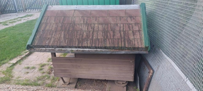 da wir keinen hund mehr haben, möchten wir diese fahrbare hundehütte hier anbieten, da sie zum entsorgen zu schade ist, sie ist für einen mittleren hund gut geeignet, wir hatten einen dobermann-labrador der sich gerne mal in diese hütte zurück gezogen hat um die lage zu checken, das dach kann man ankippen um die hütte innen zu reinigen, es wurde mit schindeln benagelt, sie ist sehr stabil gebaut und kein leichtgewicht, sie wurde regelmäßig mit holzschutz behandelt, wäre jetzt wieder fällig, kann aber der neue besitzer machen. der eingang ist 0.30 m breit und 0,53 m hoch.