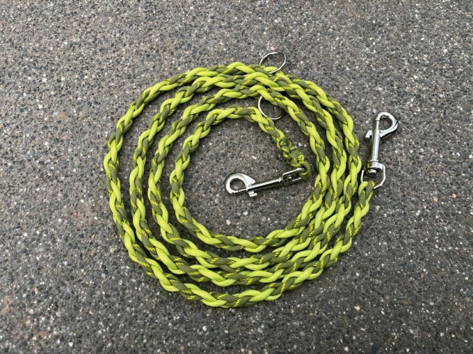 Die Leine ist einfach gebunden mit 4-Strängen und besitzt 2 Ringe zum verstellen. Sie ist sehr leicht und deshalb perfekt geeignet als Trainingsleine oder Führleine für kleine oder große Hunde.