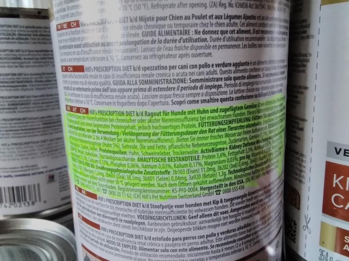 Ich biete hier 22 Dosen Hundenassfutter der Marke Hills an. Das Futter ist für Hunde die an Niereninsuffizienz leiden. Ich habe es gelb markiert, damit ihr das wichtigste schon mal nachlesen könnt. Da unser Schatz über die Regenbogenbrücke gehen musste ,verkaufen wir das Futter. Es kosten normalerweise 12 Dosen 40 € bei Fressnapf.Bitte keine Nachfrage wegen Spenden. Da Privatverkauf keine Garantie und kein Umtausch. Bei Interesse gerne melden.