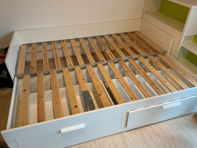 Wir verkaufen ein (Kinder-) Bett von IKEA. Brimnes. Ca. 4 Jahre alt und es ist in einem guten Zustand. Eine Latte ist gebrochen (siehe Foto) und wurde geklebt. Zusammen mit dem Bett verkaufen wir das dazugehörige Regal, was in der Regel hinter dem Bett steht und die dazugehörige Matraze. Die Maße der Matraze sind: 80x200cm. Verkauf nur Bett und Regal zusammen, gerne auch Matraze dazu. Nur Abholung in Haiger. Keine Garantie. Kein Versand. Privatverkauf. Preis ist für alle drei Artikel zusammen.