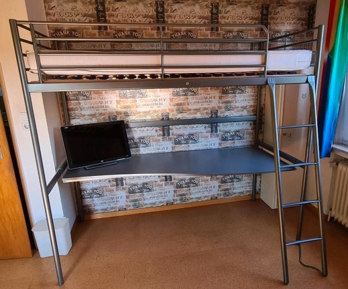 Sehr gut erhaltenes und praktisches platzsparendes Hochbett mit zusätzlicher Arbeitsplatte und verstellbaren Lattenrost.