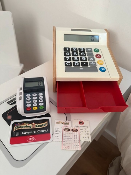 Ikea Kasse etwas älter, EC Gerät von Theo Klein (NP 17,28€) wie Neu zwei mal verwendet - Point of Sale Terminal mit Licht & Sound - Batteriebetrieben - Kreditkartenschlitz mit Sound - Contactless Payment Funktion Mit Zubehör: - 3 Belegkarten - 1 Kreditkarte mit Contactless-Payment Funktion