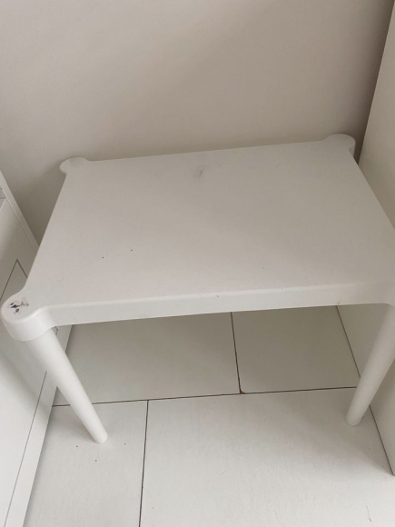 Tisch und Stuhl sind in einem guten Zustand mit leichten Gebrauchsspuren.
