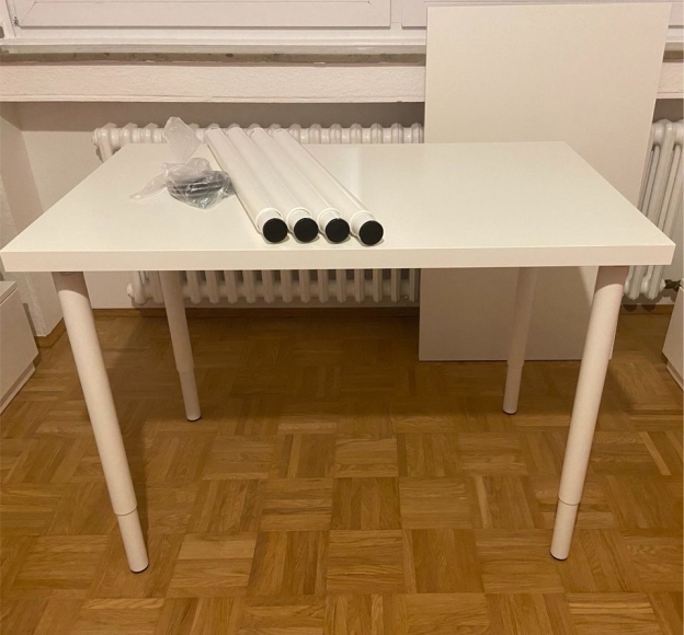 Ich verkaufe zwei IKEA Tische, bestehend aus 2 LINNMON Tischplatten, 100×60 cm in weiß in einem guten Zustand mit fast keinen und nur leichten Gebrauchsspuren (siehe Bilder) und je 4 (insgesamt 8) verstellbaren Tischbeinen OLOV in weiß in einem neuwertigen Zustand.
