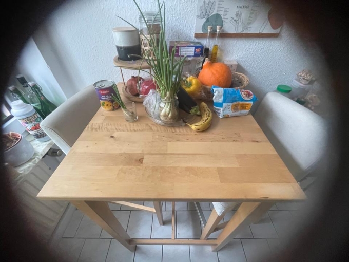 Ich verkaufe den Stehtisch Björkudden mit zwei Stühlen mit Lehnen. Der Tisch hat die Maße 70x70.