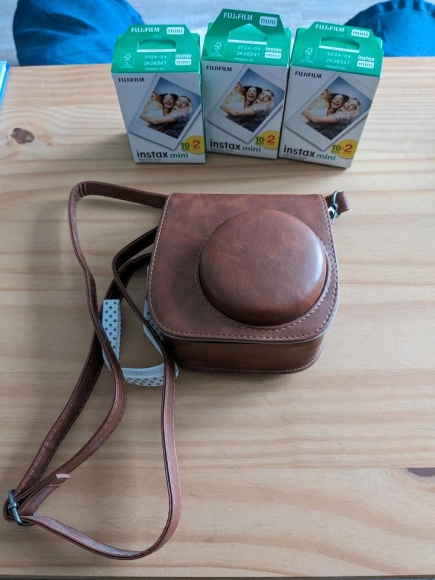 Die Instaxkamera fotografiert im Retrolook und sorgt für Sofortbilder. Sie kommt mit drei Packungen Filmen daher, die je zwei Kartuschen enthalten. Die Kamera wird durch eine Tasche in Lederoptik geschützt.