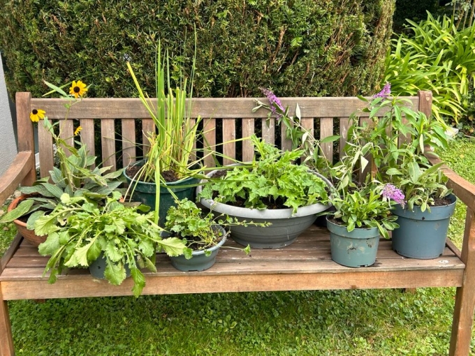Sonnenhut, Margarite, Iris, kleine und hohe Glockenblume, Kugeldistel, Sommerflieder, Flockenblume und Goldrute.