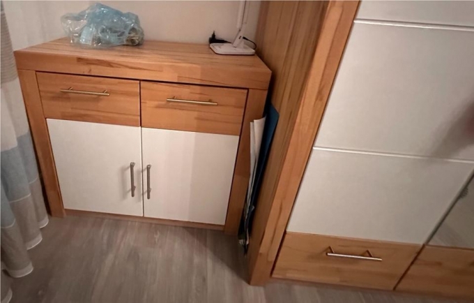 Verkaufe unser Jugendzimmer in Kernbuche teilmasiv/Hochlanz weiß. Bett Kleiderschrank Nachtschrank Kommode und Lattenrost.