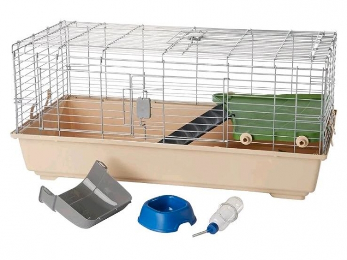 Es ist alles wie auf den Bildern abgebildet dabei. Der Käfig ist 1 m x 50cm x 60 cm