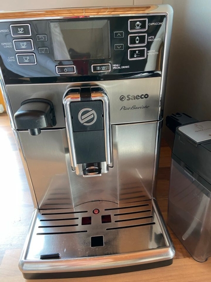 Biete einen gebrauchten Kaffeevollautomat von Saeco , Typ Pico Baristo. Die Kaffeemaschine funktioniert fehlerfrei und ist in einem guten gepflegten Zustand mit normalen Gebrauchsspuren. Beim Wassertank fehlt der Tragegriff, der hat leider dem Gewicht des Inhaltes nicht standgehalten. Beim Milchbehälter ist eine Arretierung im Deckel abgebrochen, beeinträchtigt die Funktion aber nicht.