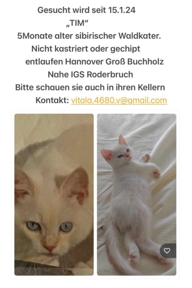 „Tim“ 5Monate alter sibirischer Waldkater weiß mit blauen Augen wird vermisst