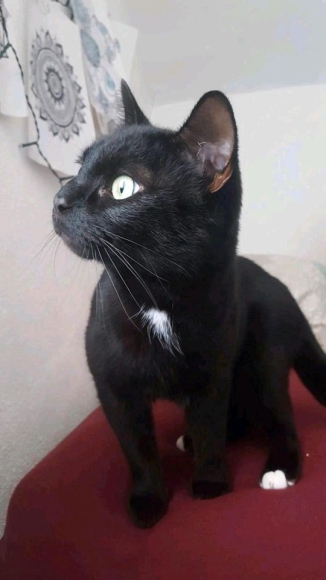 Mikesch hat grüne Augen, schwarzes Fell, einen weißen Latz und weiße Hinterpfoten. Er hat eine eher zierliche Statur und ist etwas scheu.