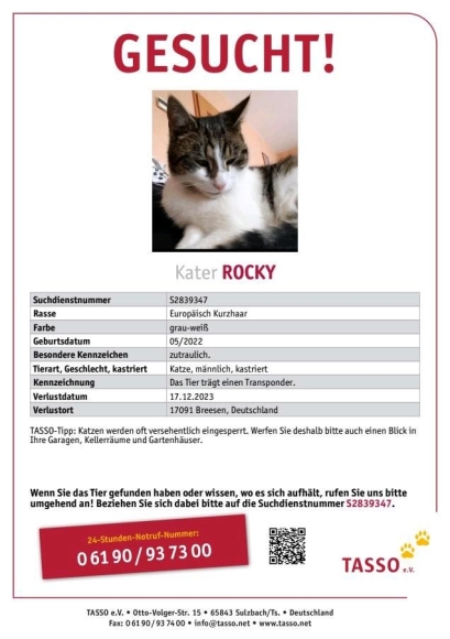 Vermisst wird seit der Nacht vom 17. Zum 18.12. unser 18 Monate alter Kater Rocky.
