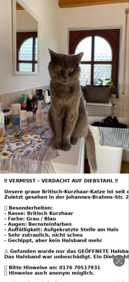 Katze in Kornwestheim vermisst,möglicherweise gestohlen