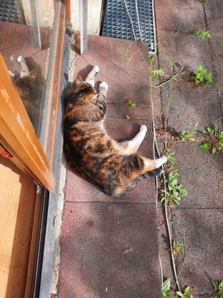 Lotte ist eine europäisch Kurzhaar tricolor. Auffällig sind weiße "Socken" an den Vorderpfoten und weiße "Strümpfe" an den Hinterläufen.