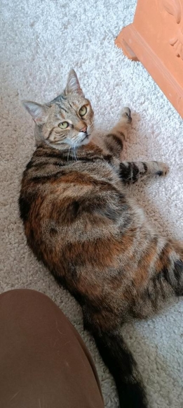 Sie ist Grau,Rot und Braun mit Schwarzer Musterung und hat grüne Augen.