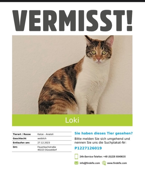 Unsere Loki ist seit dem 27.12.2023 aus der Wohnung raus. In Düsseldorf in der Feuerbachstrasse. Sie ist weiblich kastriert 1 Jahr alt. Sie wird sehr vermisst sie ist eine Hauskatze. Sie könnte sich überall aufhalten in Garagen Scheunen Keller. Wer sie gesehen hat oder evtl. abgegeben hat in einem Tierheim oder bei sich zu Hause bitte melden.