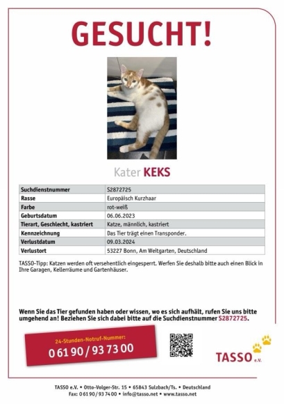 Wir suchen seit dem 09.03.2024 unseren Kater Keks. Er ist in Oberkassel Am Weitgarten entlaufen.