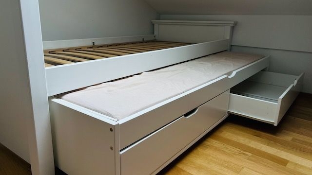 Das Bett ist gebraucht, keine Kratzer an den sichtbaren Seiten. Lediglich die ausziehbaren "Gästebett" Schienen haben Gebrauchsspuren, die aber nur sichtbar sind, wenn das Gästebett ausgezogen ist.