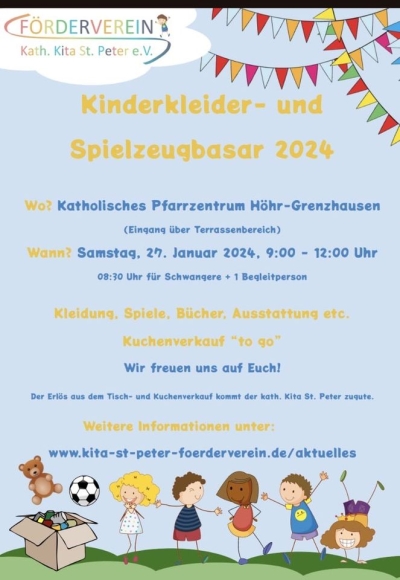Kinderkleider- und Spielzeugbasar am Samstag, den 27. Januar 2024 von 9:00 Uhr bis 12:00 Uhr im Katholischen Pfarrzentrum in 56203 Höhr-Grenzhausen.