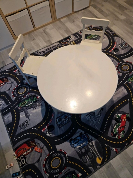 Wurde vor etwa 12 Jahren bei Ikea gekauft und hat dementsprechende Gebrauchsspuren. Die Stühle sind mindestens 90kg belastbar.