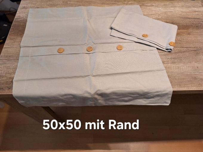 Hier zwei sehr schöne beige Kissenbezüge mit dekorativen Holzknöpfen in Größe 50x50cm. Passt prima zu Holzmöbeln oder auch Trachtenmustern. Die Bezüge sind am Rand abgesteppt, so dass dieser etwas übersteht. Ich habe keine Flecken oder Beschädigungen gesehen. Preis gilt für beide zusammen, Einzelpreis je 1 Euro.