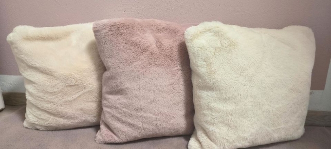 Weiche kuschelige Kissenhüllen ohne Kissen 3× Creme und 3× Puder keine Flecken in einem sehr guten Zustand wie neu je Kissenhülle 3.50 Euro alles zusammen 18 Euro ( ohne Kissen)