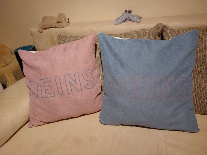 Verkaufe hier die 2 sehr süße Partner Kissenhüllen mit der Aufschrift Deins (blau auf rosa, Rückseite blau auf weiß) und Meins (rosa auf blau, Rückseite rosa auf weiß).