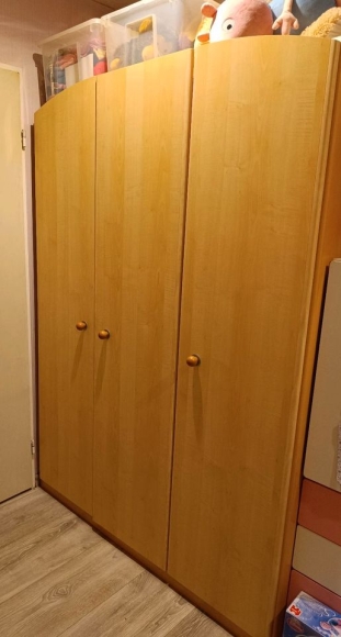 Kleiderschrank Buche... Eine Stange im großen Teil plus ein Einlageboden. Schmaler Teil hat nur Einlageböden. Guter Zustand