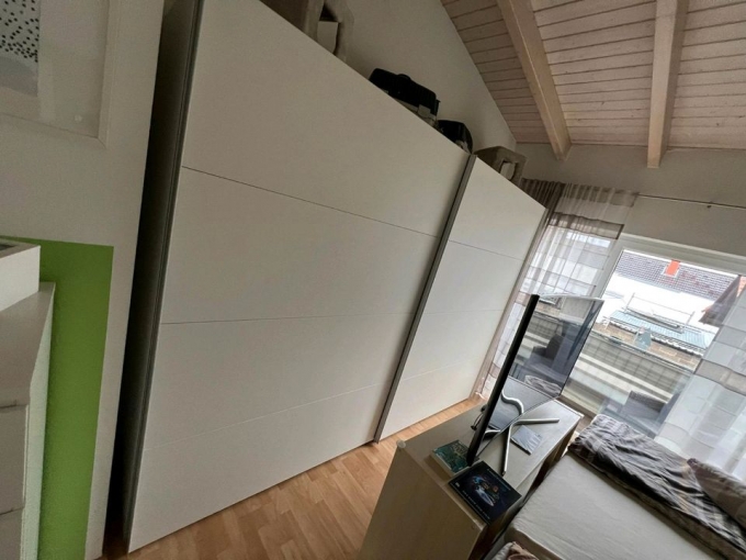 Wir verkaufen einen Schwebetürenschrank (ohne Inhalt, Deko etc). Der Schrank ist 60 cm tief (mit Türen: 66 cm), 300 cm breit und 216 cm hoch.
