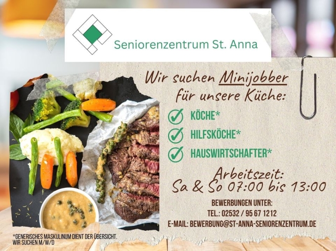 Das Seniorenzentrum St. Anna Neubeckum sucht engagierte und erfahrene Köche, Hilfsköche und Hauswirtschafter, um unser Team zu verstärken.