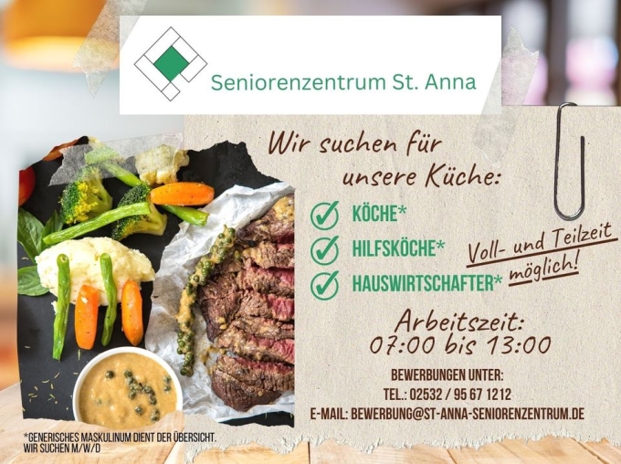 Das Seniorenzentrum St. Anna Neubeckum sucht engagierte und erfahrene Köche, Hilfsköche und Hauswirtschafter, um unser Team zu verstärken.