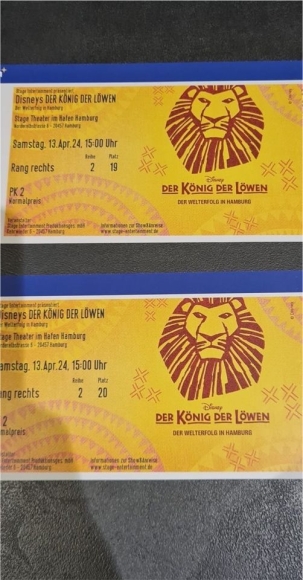 Verkaufe zwei Tickets für das Musical König der Löwen in Hamburg. Leider können wir am Samstag nicht teilnehmen. Rang rechts, Reihe 2 Platz 19 und 20.