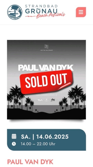 Krankheitsbedingt muss ich leider mein Ticket für das Beachfestival von Paul van Dyk am Samstag , den 14.6.2025 im Strandbad Grünau abgeben.