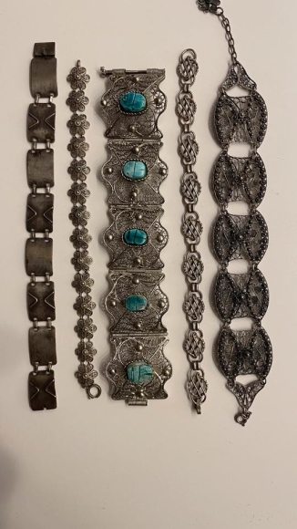 5 Armbänder in einem sofort tragbaren Zustand. Bei einem Armband habe ich eine Punze gefunden. Nur das Armband mit den türkisen Steinen ist magnetisch.