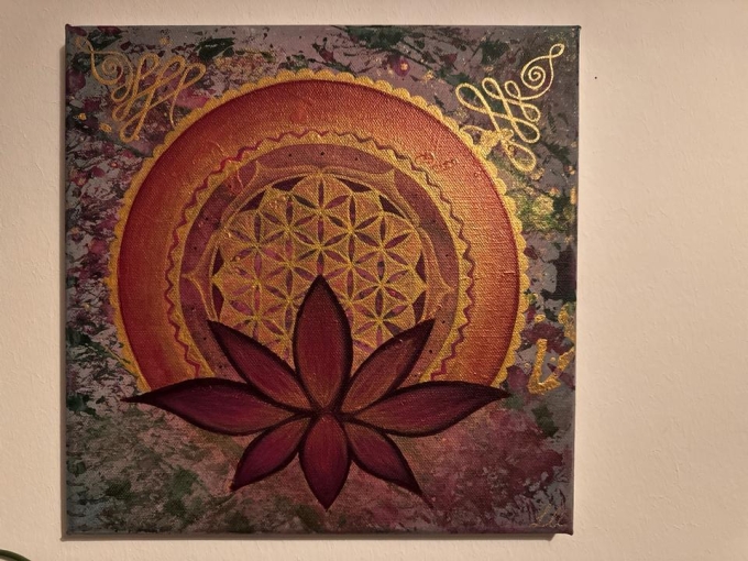 Ich biete hier ein kraftvolles strahlendes Energiebild mit der Blume des Lebens, einer Lotusblume und in den oberen Ecken je einem Unalome Symbol.