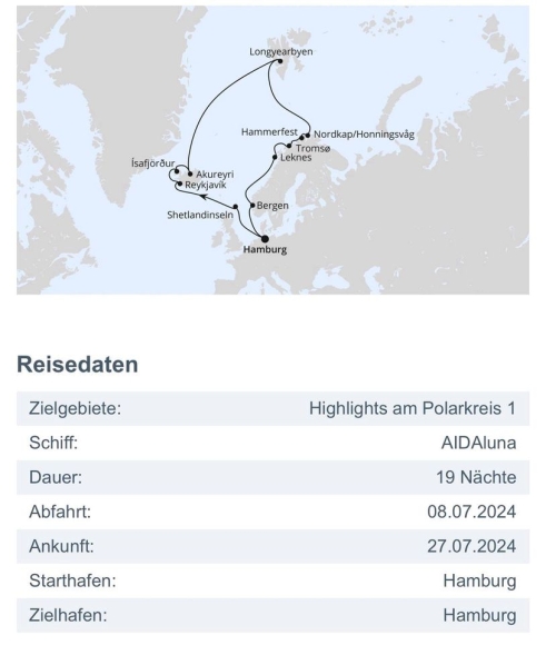 Die Reise beginnt am 08.07.2024 in Hamburg und führt über die Shetland Inseln, drei Stopps in Island, dann über Spitzbergen zum Nordkap und über weitere vier Stopps im schönen Norwegen wieder zurück nach Hamburg.