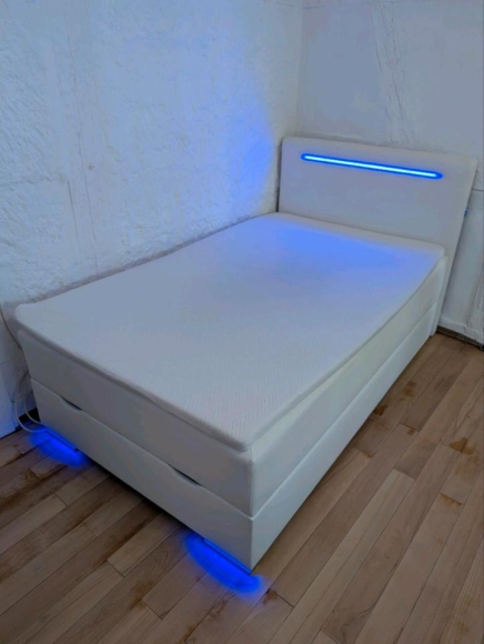 Das Bett hat eine LED Beleuchtung am Kopfteil und an den Füßen, ein USB Anschluss zum Laden vom Smartphone ist auch vorhanden.