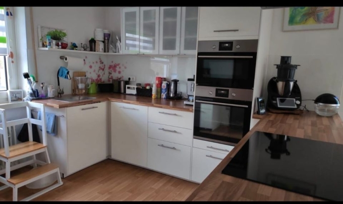 Mikrowelle und ein Backofen mit Pyrolyse. Dunstabzugshaube ist auch dabei mit Ersatz Filter. Spülmaschine mit Licht und automatischer Türöffnung und Spüle mit Wasserhahn. Küche ist einem sehr guten Zustand. Küche ist bereits abgebaut und könnte jederzeit abgeholt werden.