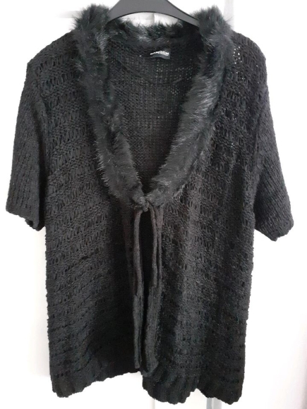 Verkaufe diese schwarze kurzärmlige Jacke von Samoon by Gerry Weber aus Bändchengarn. Vorne ist die Weste unterhalb des Kragens zum Binden.