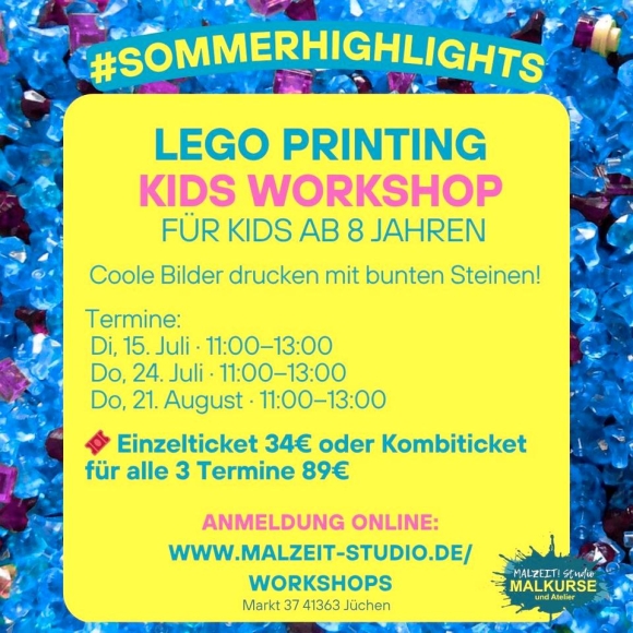 Bausteine kennt jede*r! Aber wusstest du, dass man mit LEGO & Co. auch richtig cool drucken kann? In unserem Ferien-Workshop zeigen wir dir, wie du mit Acrylfarben und Klemmbausteinen eigene, bunte Druckmotive gestaltest.