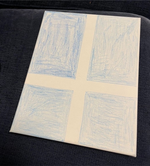 Mit Buntstift (Bleistift) bemalte Leinwand zum Übermalen. Größe etwa DIN A4