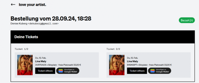 Ich habe die Tickets am 28.09. bei "love your artist" gekauft und digital zugeschickt bekommen (PDF und Wallet-Ticket). Nach Kauf sende ich Euch alles direkt per Mail zu. Kauf mit Käuferschutz ist möglich, genauso wie die Zahlung via Paypal. Kann also alles sehr schnell abgewickelt werden.