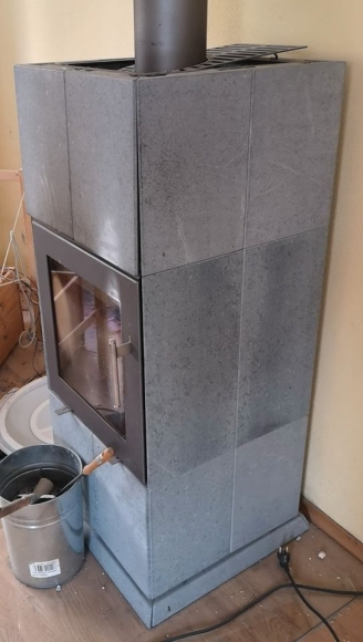 Der Ofen wiegt 525 kg (!) und ist mit hochwertigem Specksteinplatten verkleidet und gefüllt. Die Platten sind gesteckt und können leicht transportiert und montiert werden.
