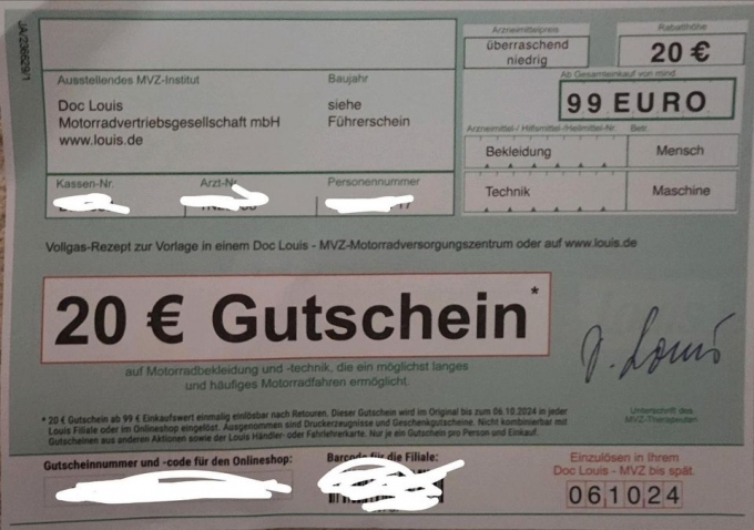 Ich verkaufe einen 20€ Gutschein der Marke Louis. Man muss für mindestens 99 Euro einkaufen, um den Gutschein einlösen zu können.