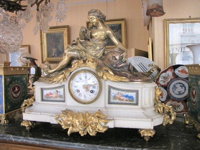 Uhr Louis-XVI aus Marmor und Porzellan mit 2 Beistellern aus Bronze/Porzellan.